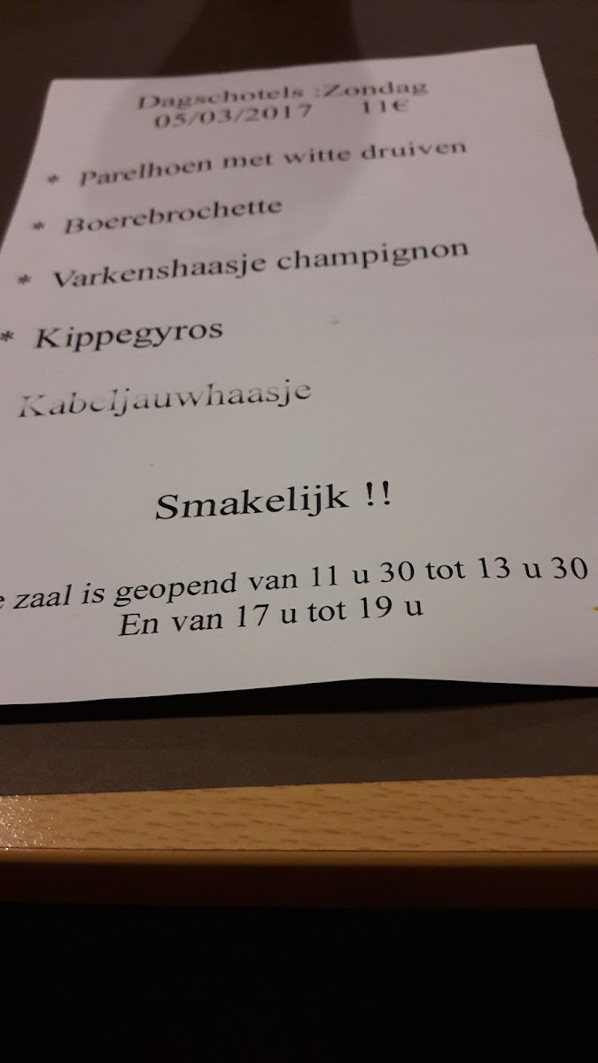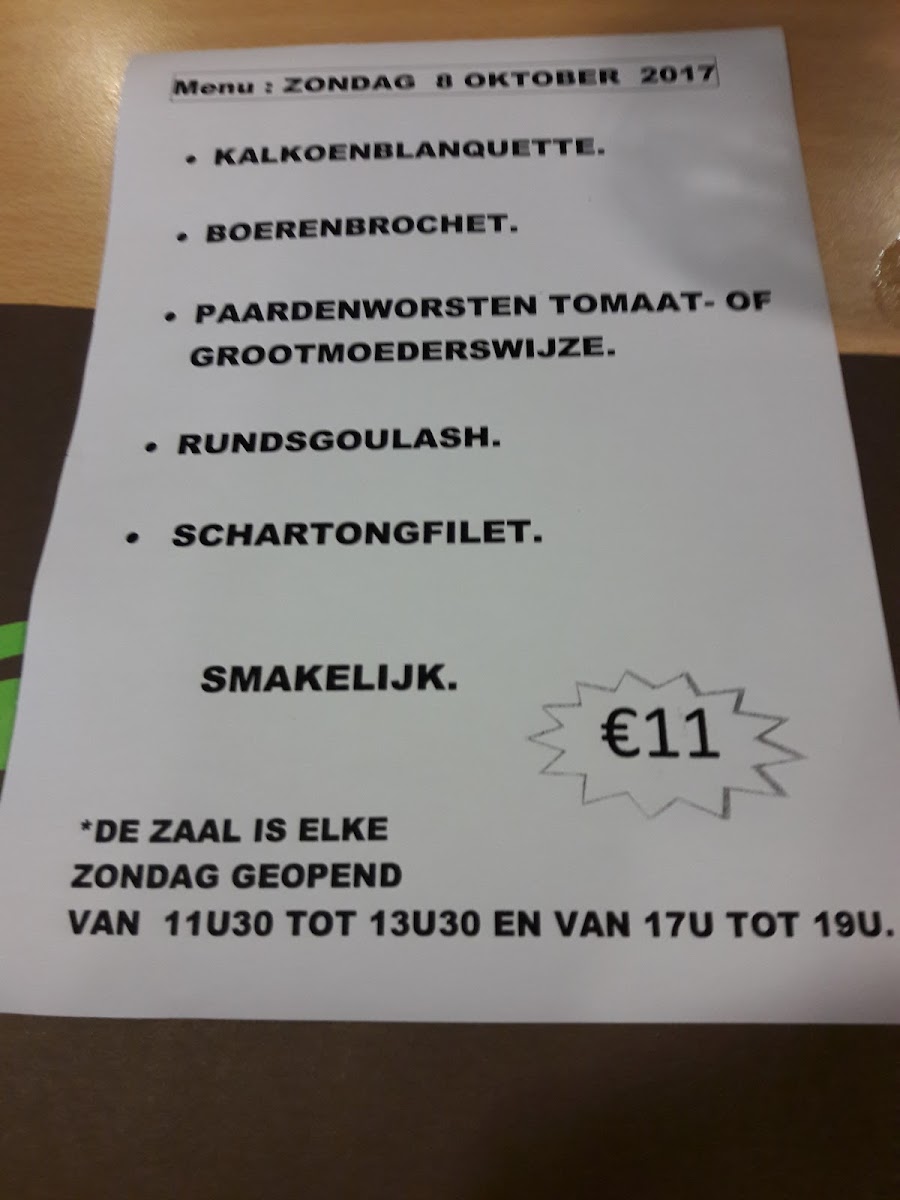 Located in Kouterstraat 111, Zele, this cafe offers a menu focused on traditional and light meals suitable for various times of the day, including breakfast, coffee breaks, and casual dining. The menu consists primarily of hot and cold beverages such as coffee and tea, alongside light food options and snacks commonly served in a cafe setting.